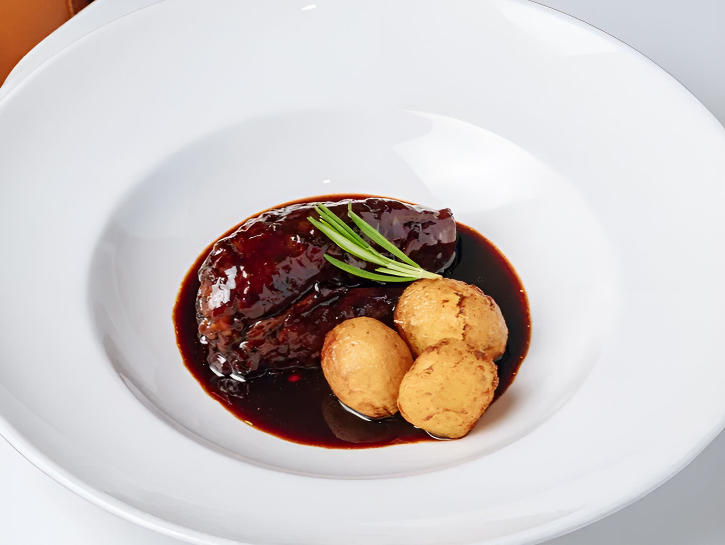 Мясо утки мягкое, нежное и легко отделяется от кости. Кожица хрустящая. Соус из красного вина добавляет легкую кислинку и пикантность