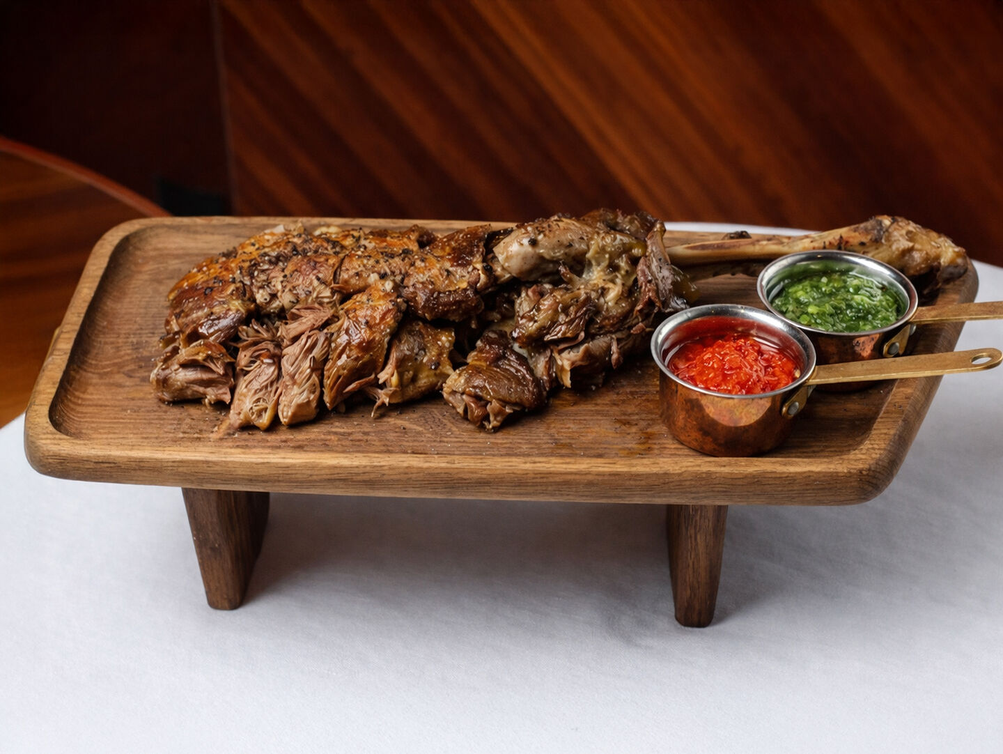 Мясо ягненка нежное и мягкое, с насыщенным вкусом. Лук конфи и фенхель добавляют сладость. Соусы чимичурри и пири-пири придают пикантность и легкую остроту